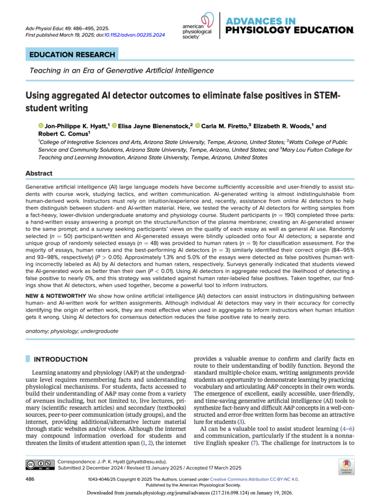 In March 2025, a study published by the American Physiological Society proved a concept of how to test for AI-written essays while also reducing false positives to “essentially zero.” TL;DR When testing 3 or more detectors for AI-generated text, the probability of finding a false positive is nearly 0%. Purpose of Study The study was … Read more