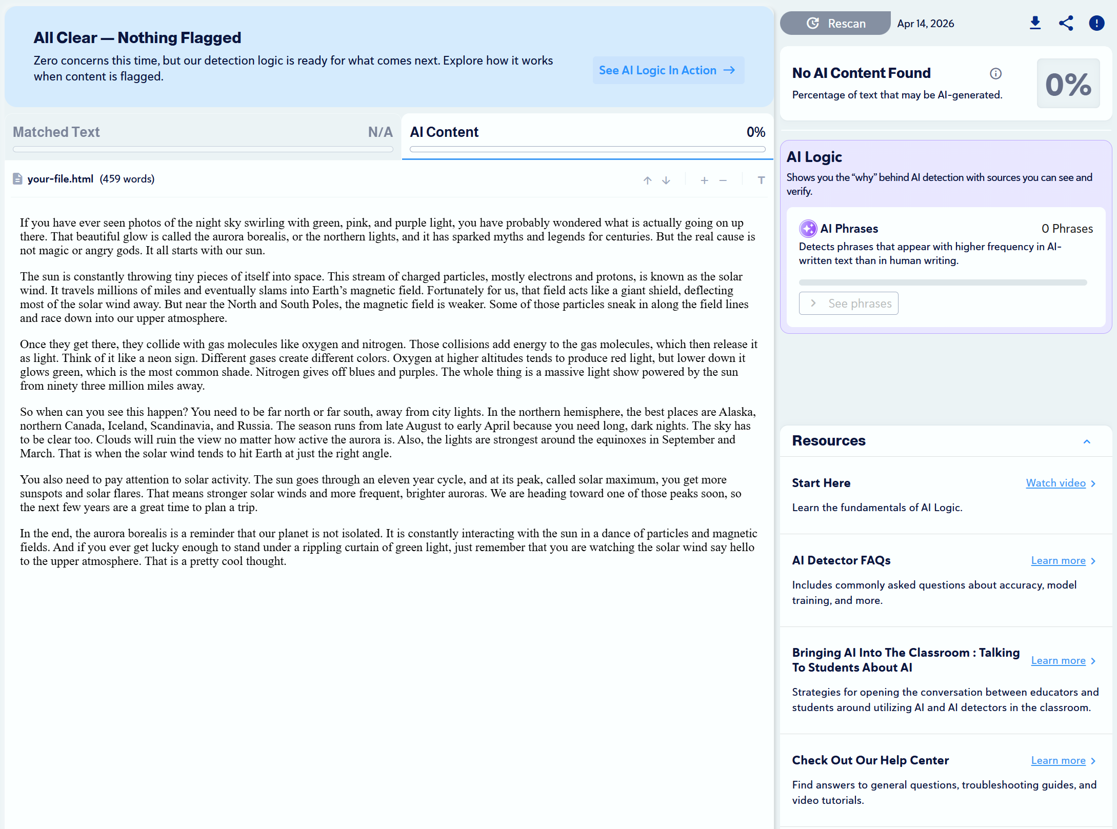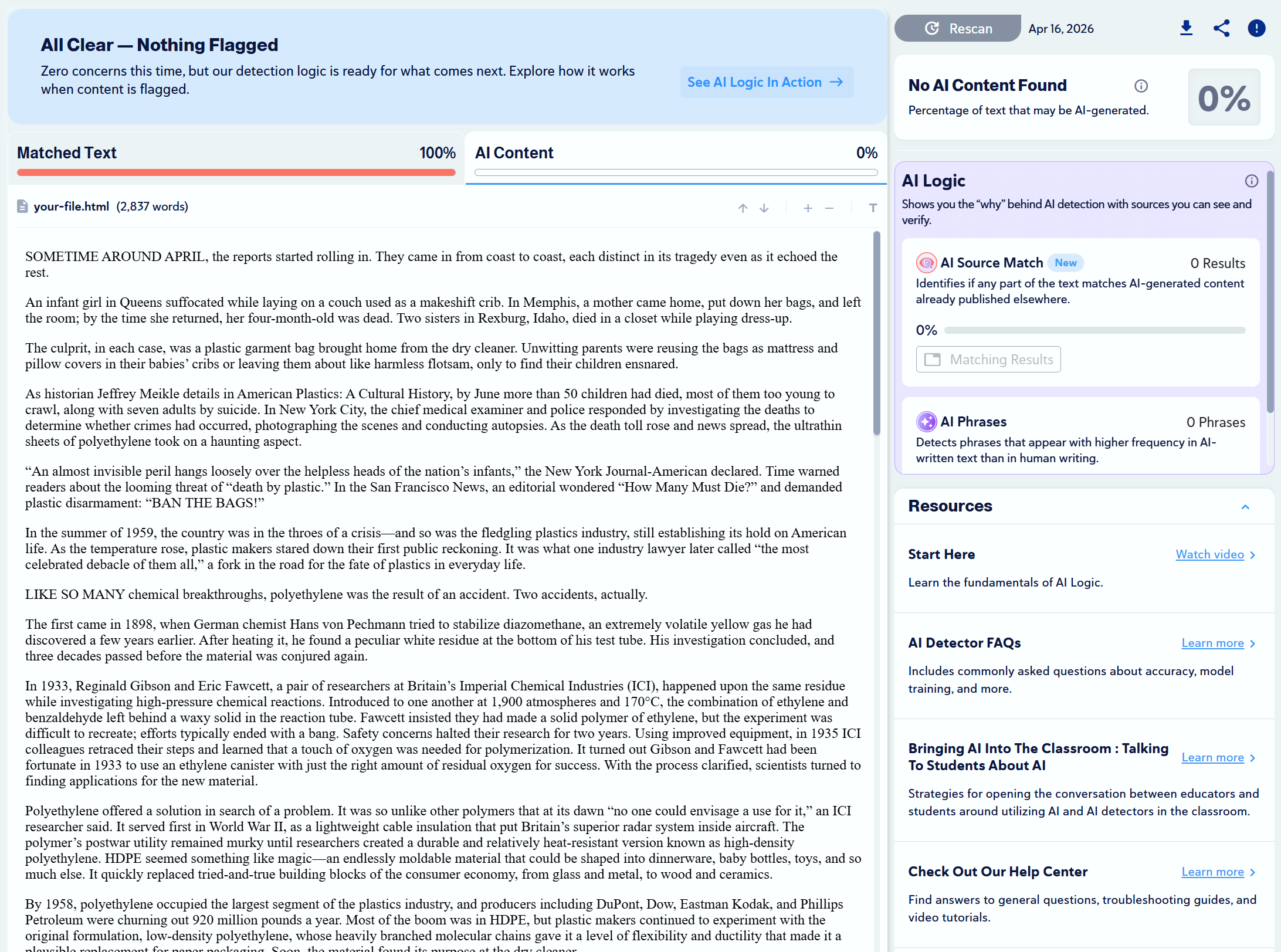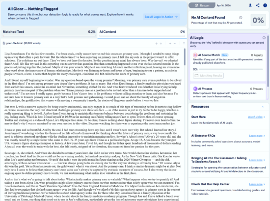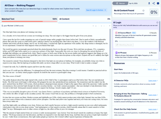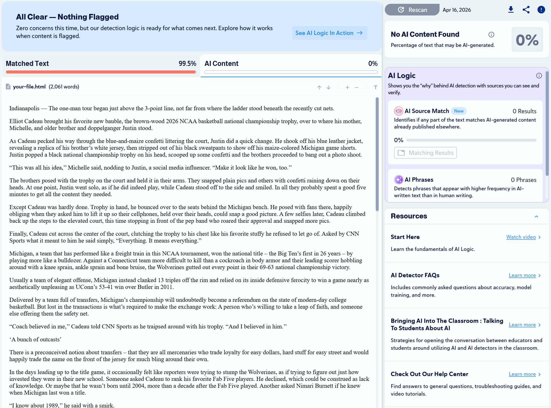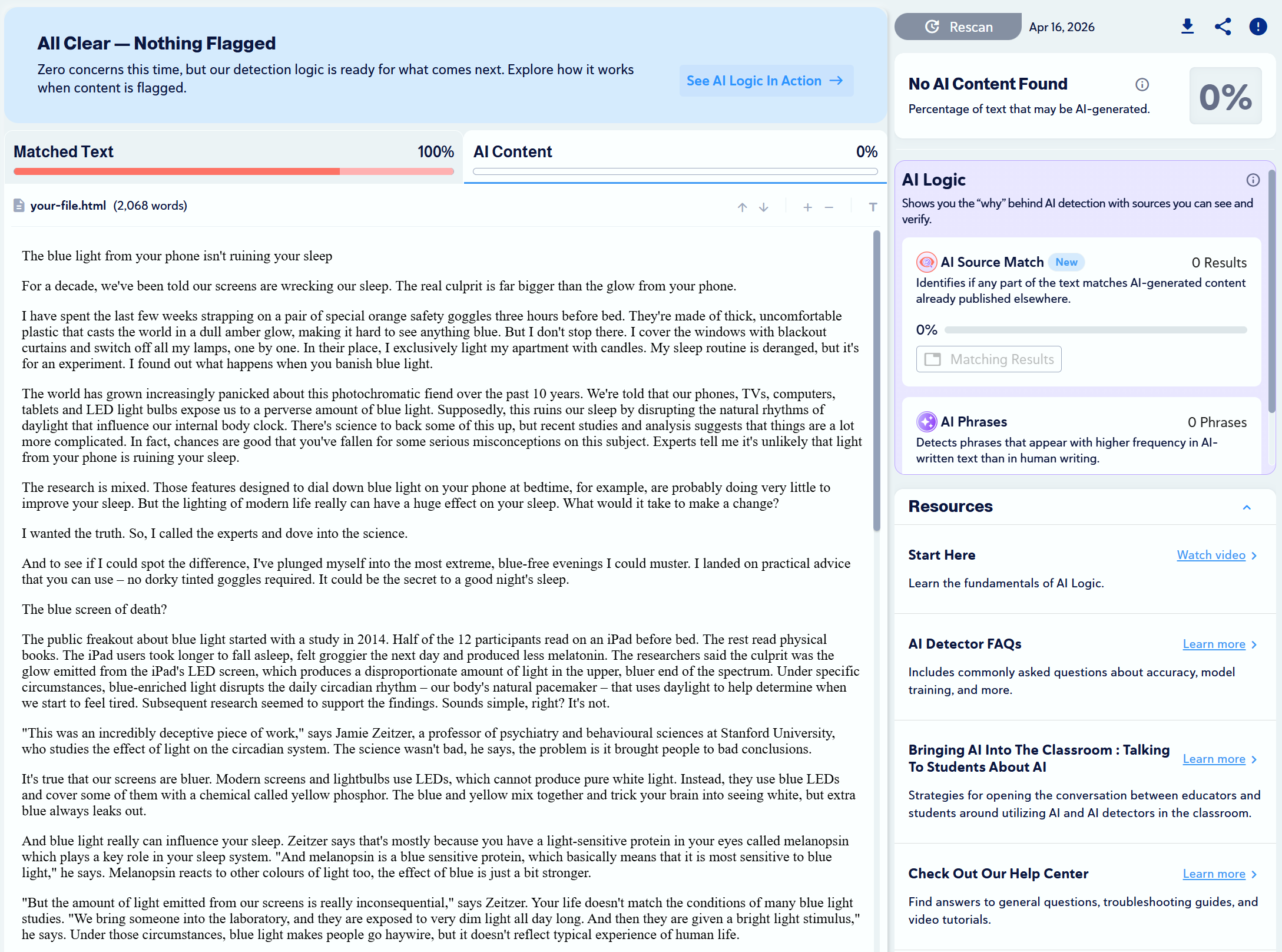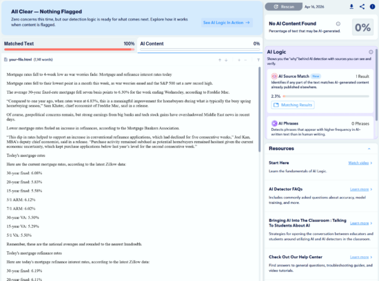 We found 10 articles that were written by humans and scanned them with Copyleaks to check for plagiarism and to see if any would be mistaken as AI-generated.