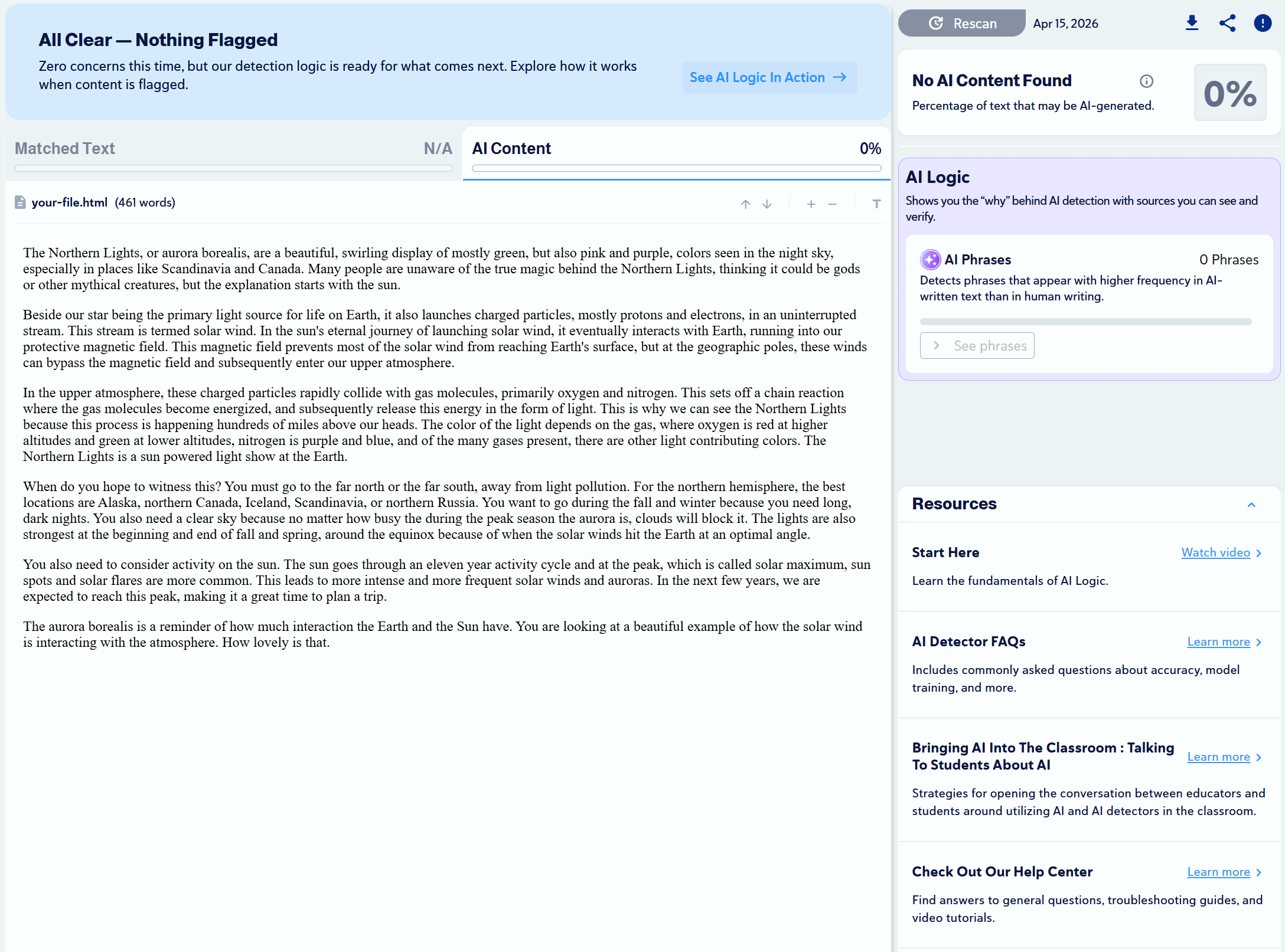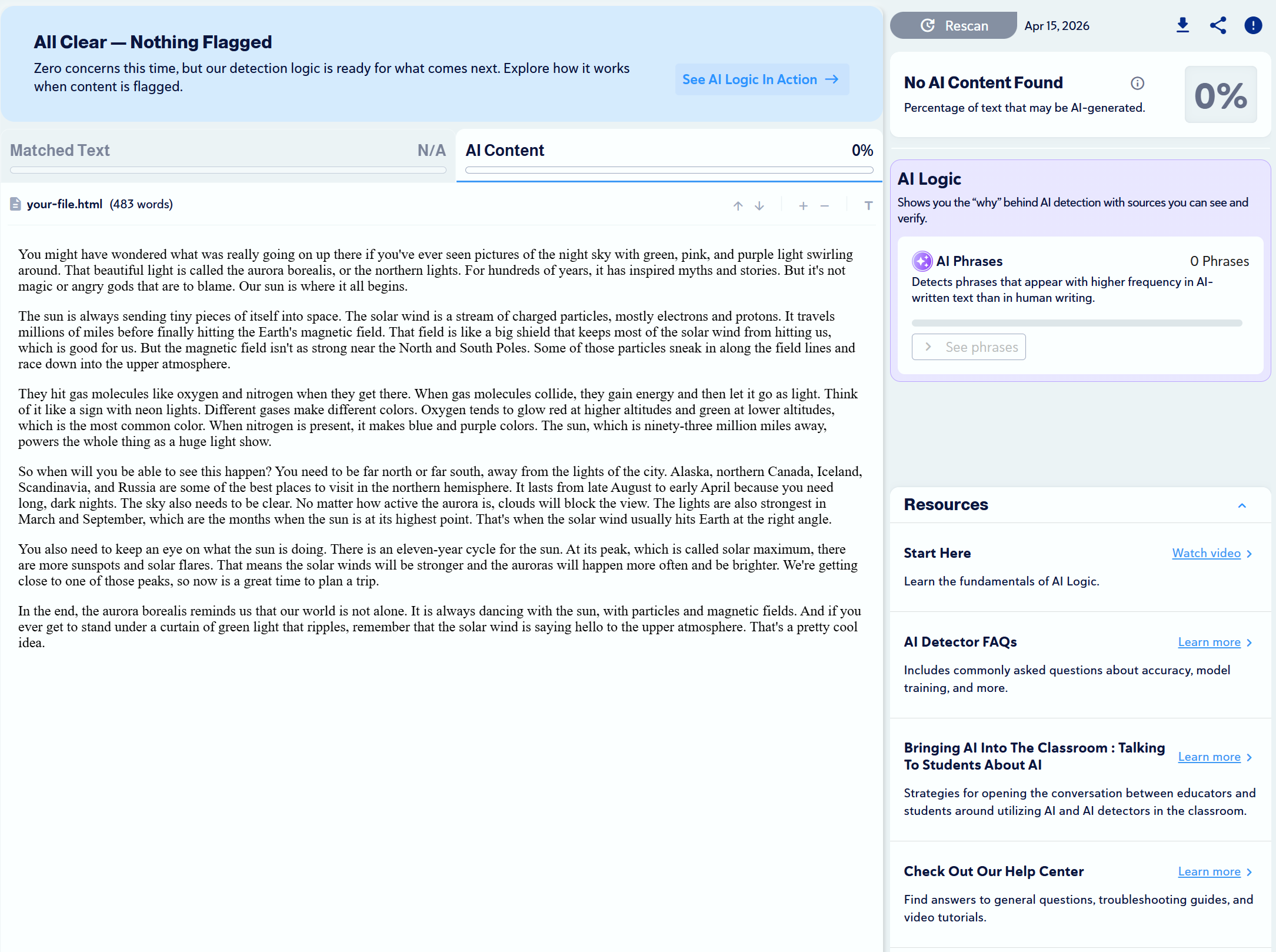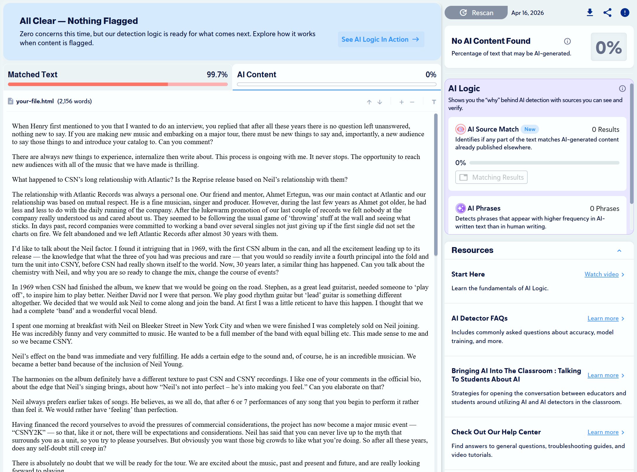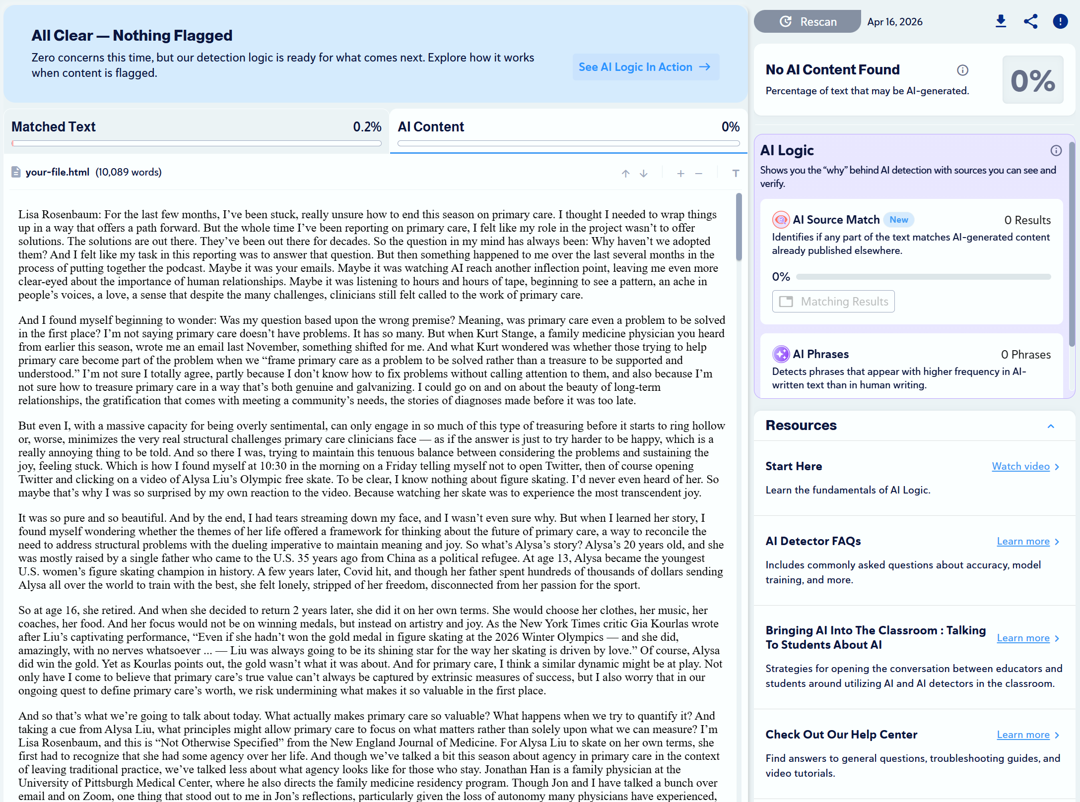 We found 10 articles that were written by humans and scanned them with Copyleaks to check for plagiarism and to see if any would be mistaken as AI-generated.