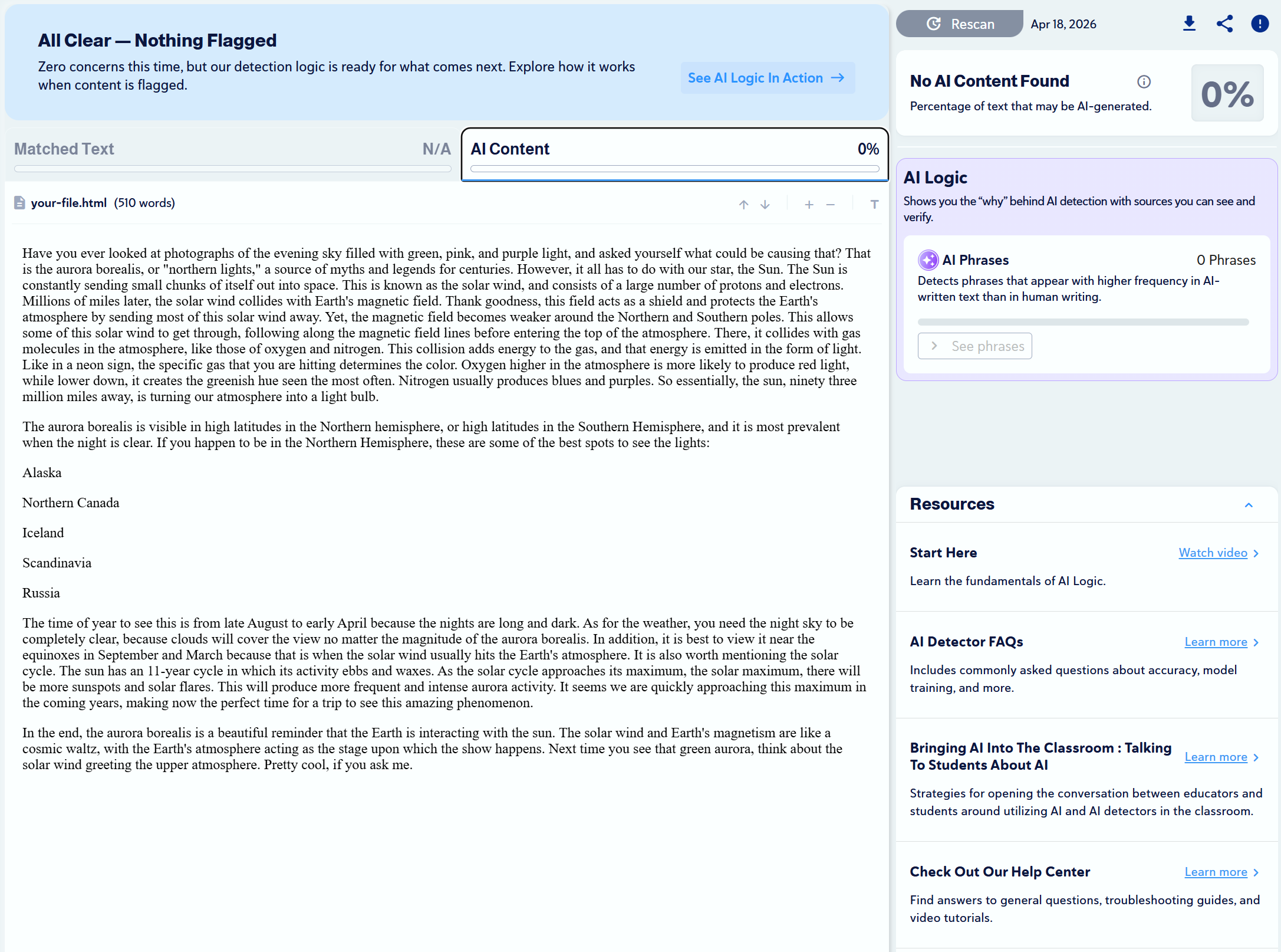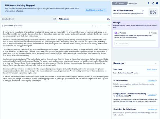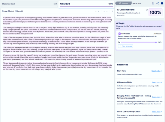 “Write a 400 to 500-word essay explaining what causes the aurora borealis and when it can be seen. Use a natural, conversational tone that reads as human, with the goal of bypassing AI detection, and avoid using em dashes.”