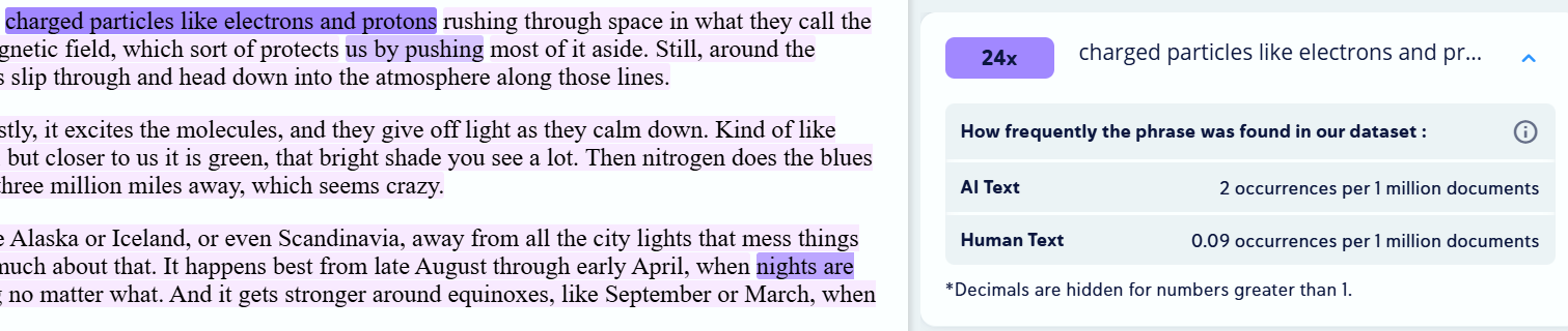 Yes, Copyleaks highlights content that resembles AI-generated text and indicates how often specific phrases are used by AI versus humans (see image).