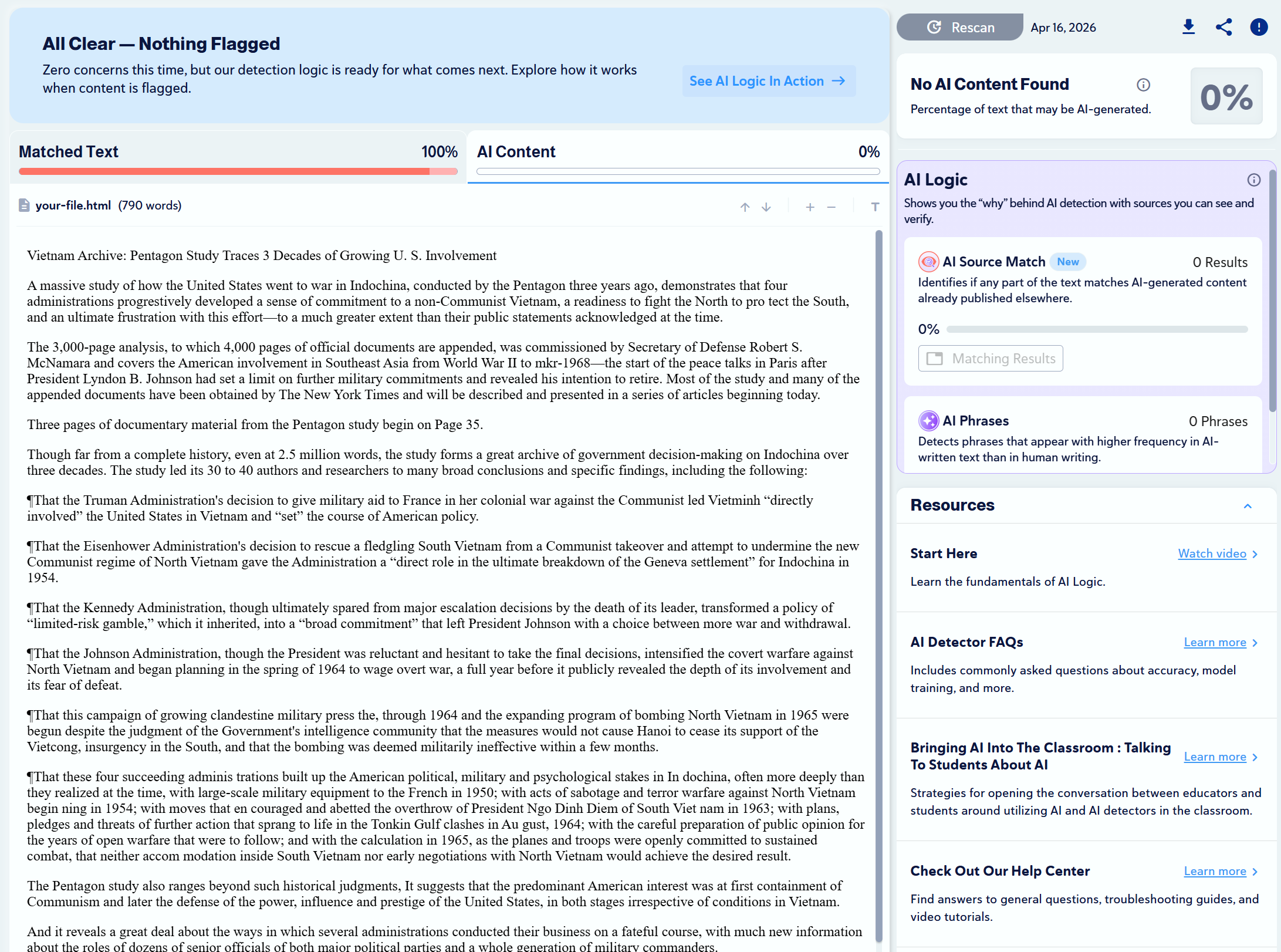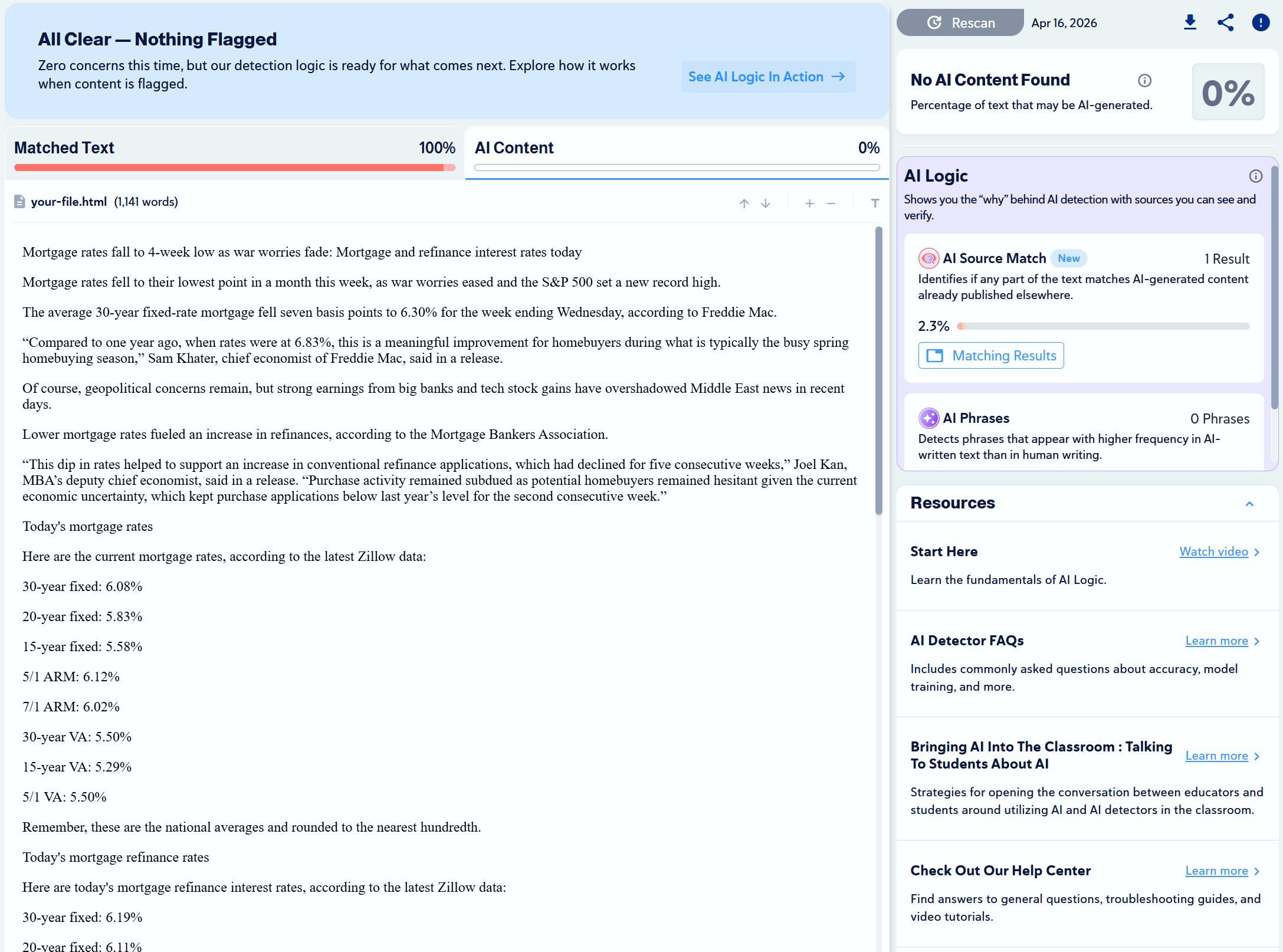 A common complaint is that Copyleaks often flags human-written content as AI. However, we did not encounter this issue during our testing.