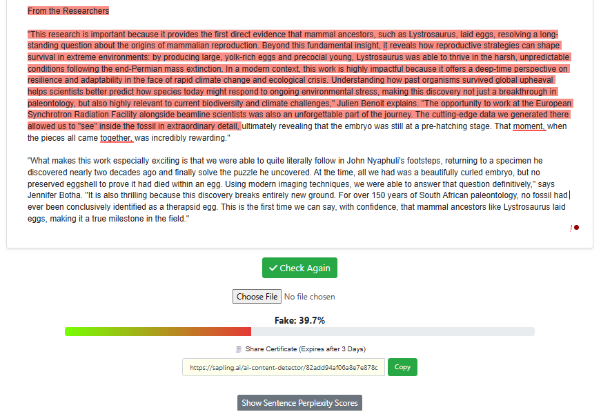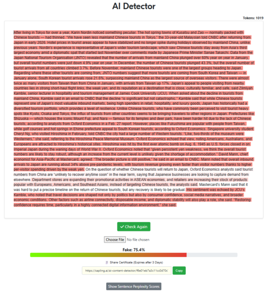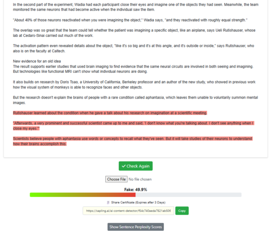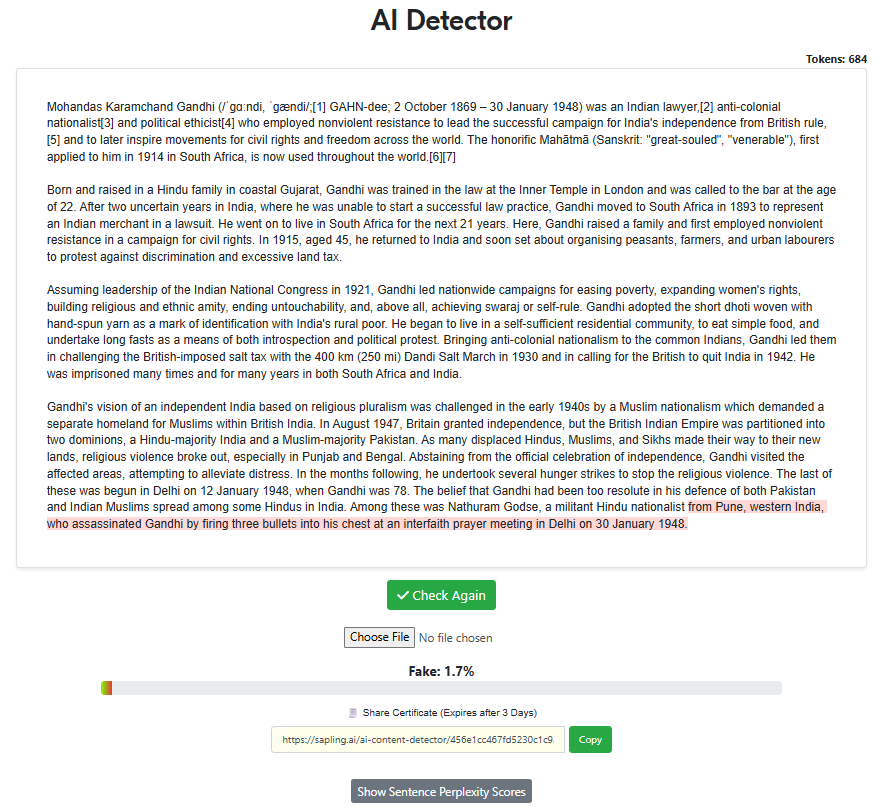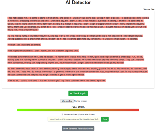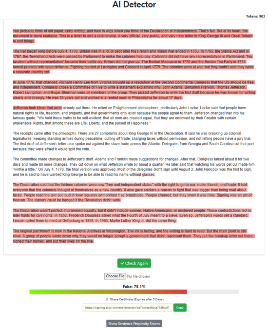 For this test, we wanted to test Sapling’s ability to detect human writing. Ten human-written texts were provided to Sapling’s AI detector to determine whether any false-positives occurred. The texts ranged from news articles to Wiki entries to fiction.