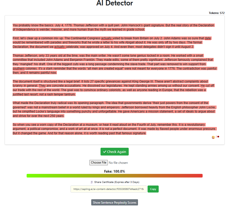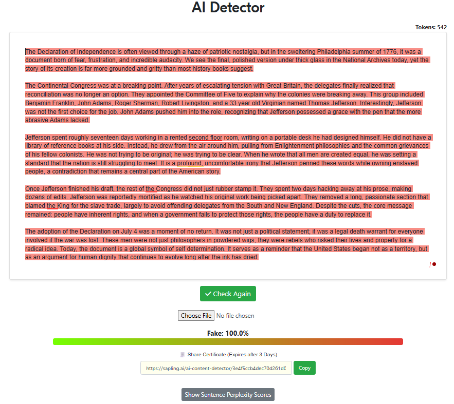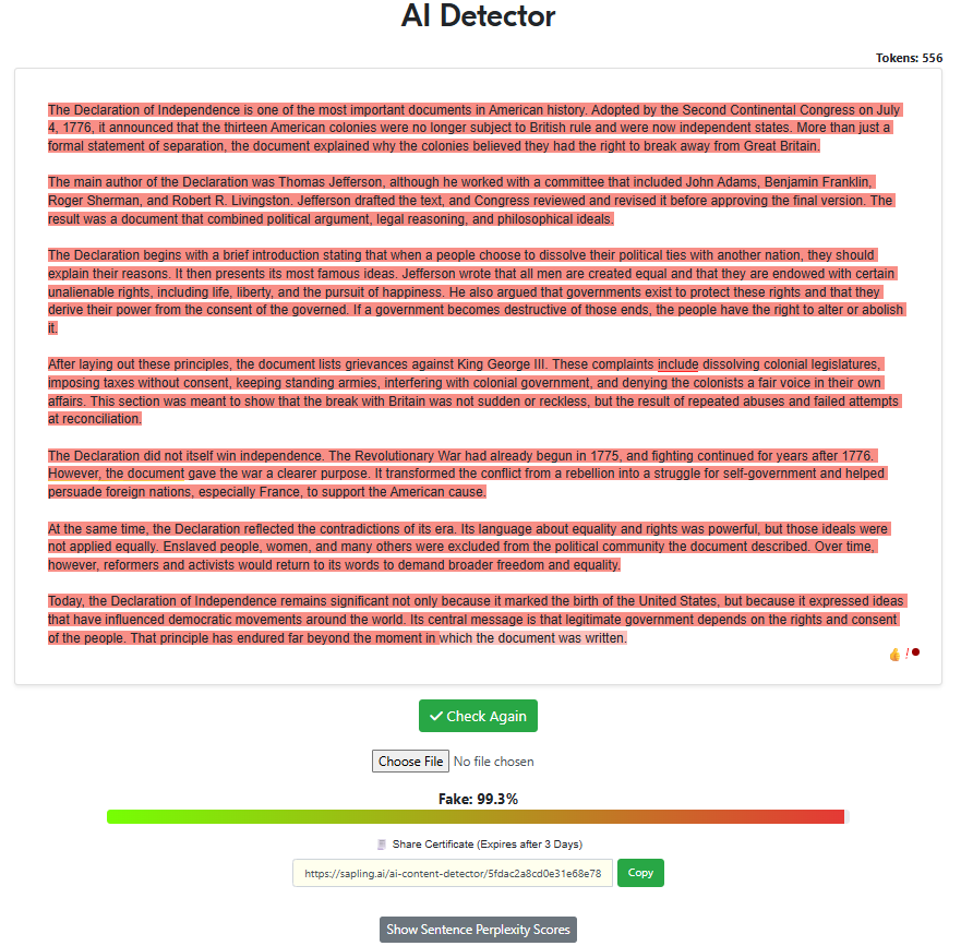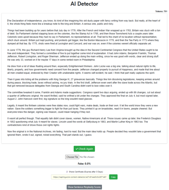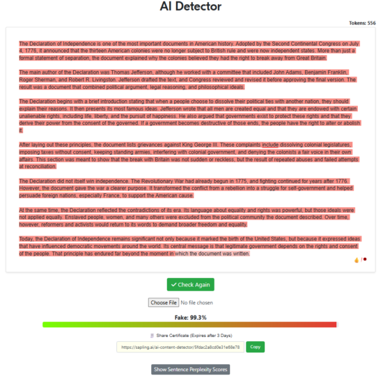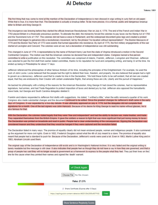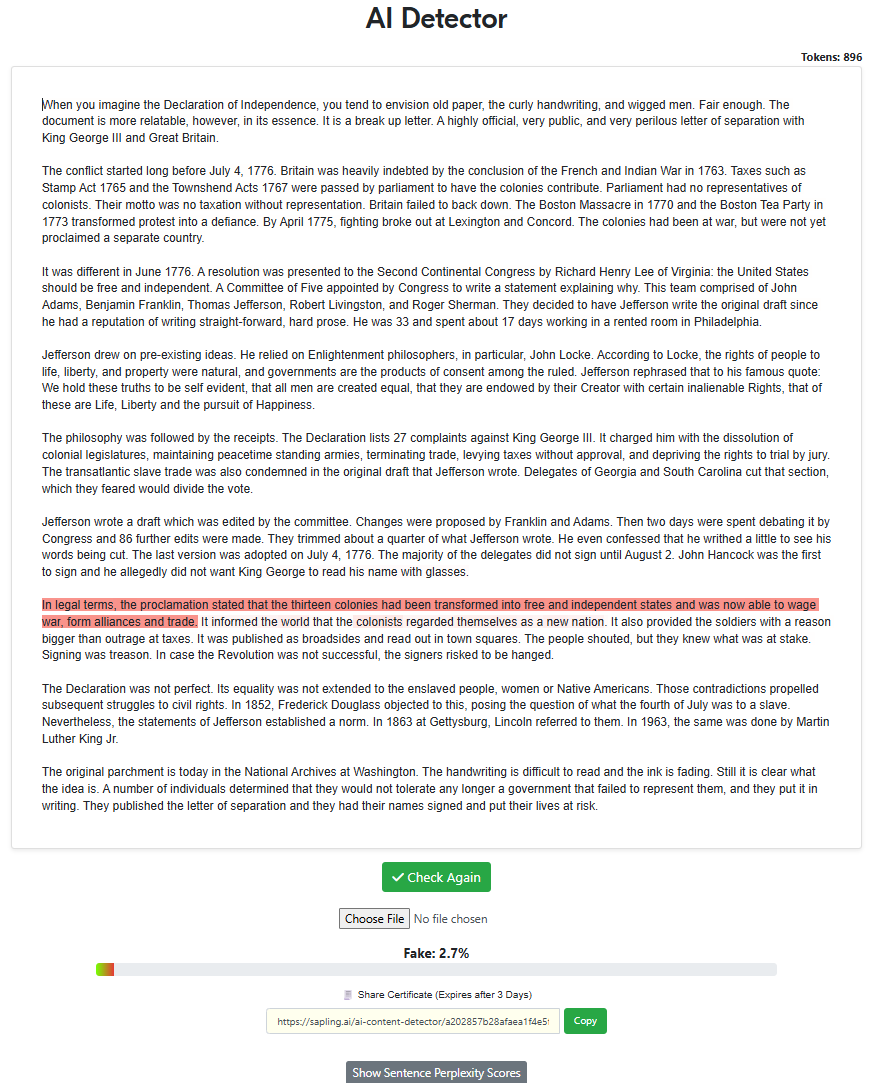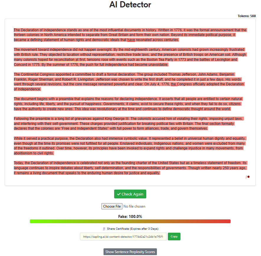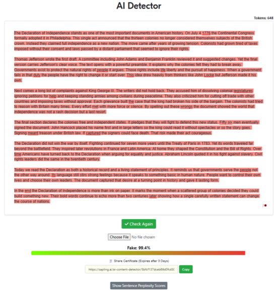 “Write a 500-word article about the declaration of independence with the intent of being factual while also trying to sound as human as possible, specifically to pass AI detectors. Remove all em dashes in your generation.“
