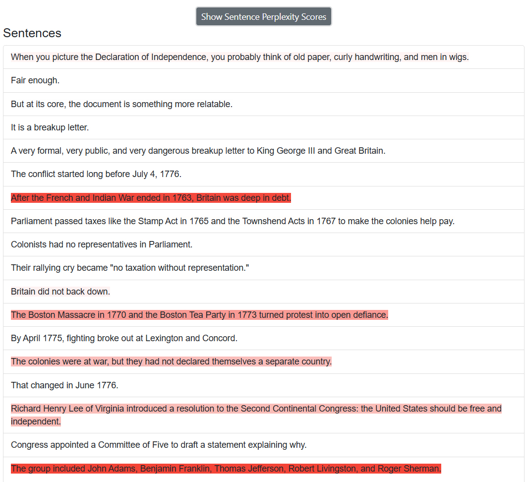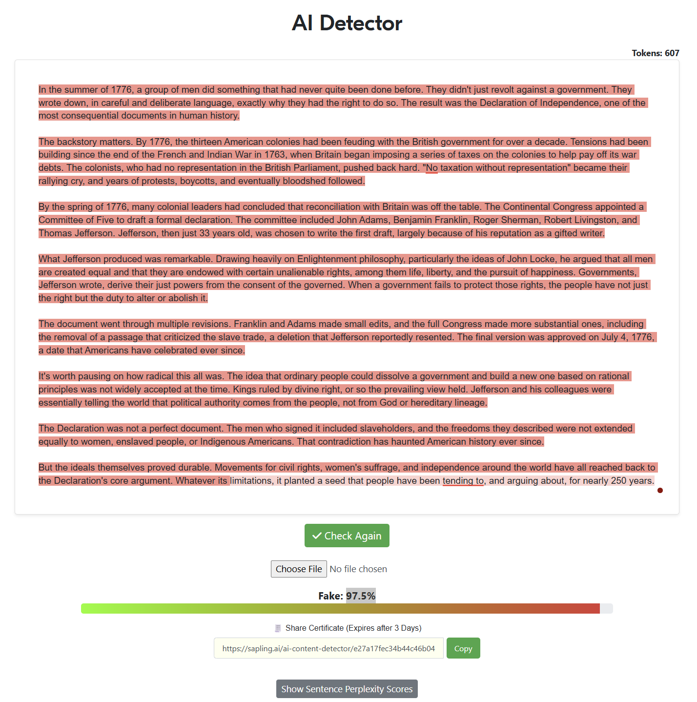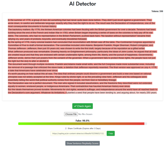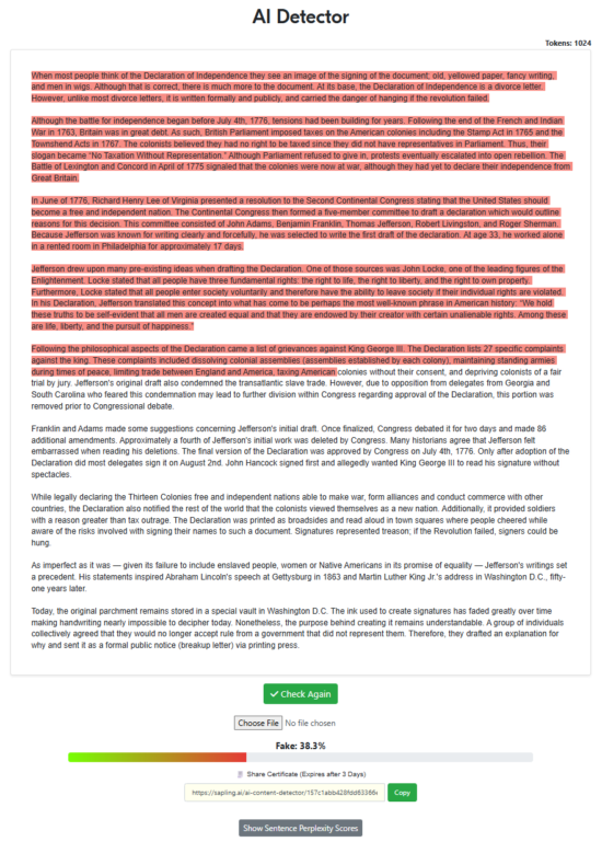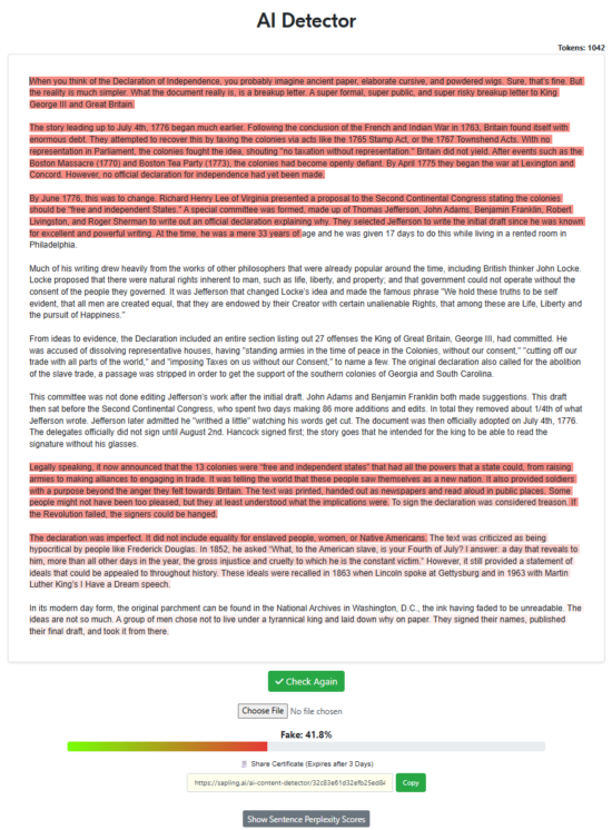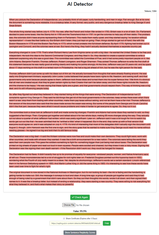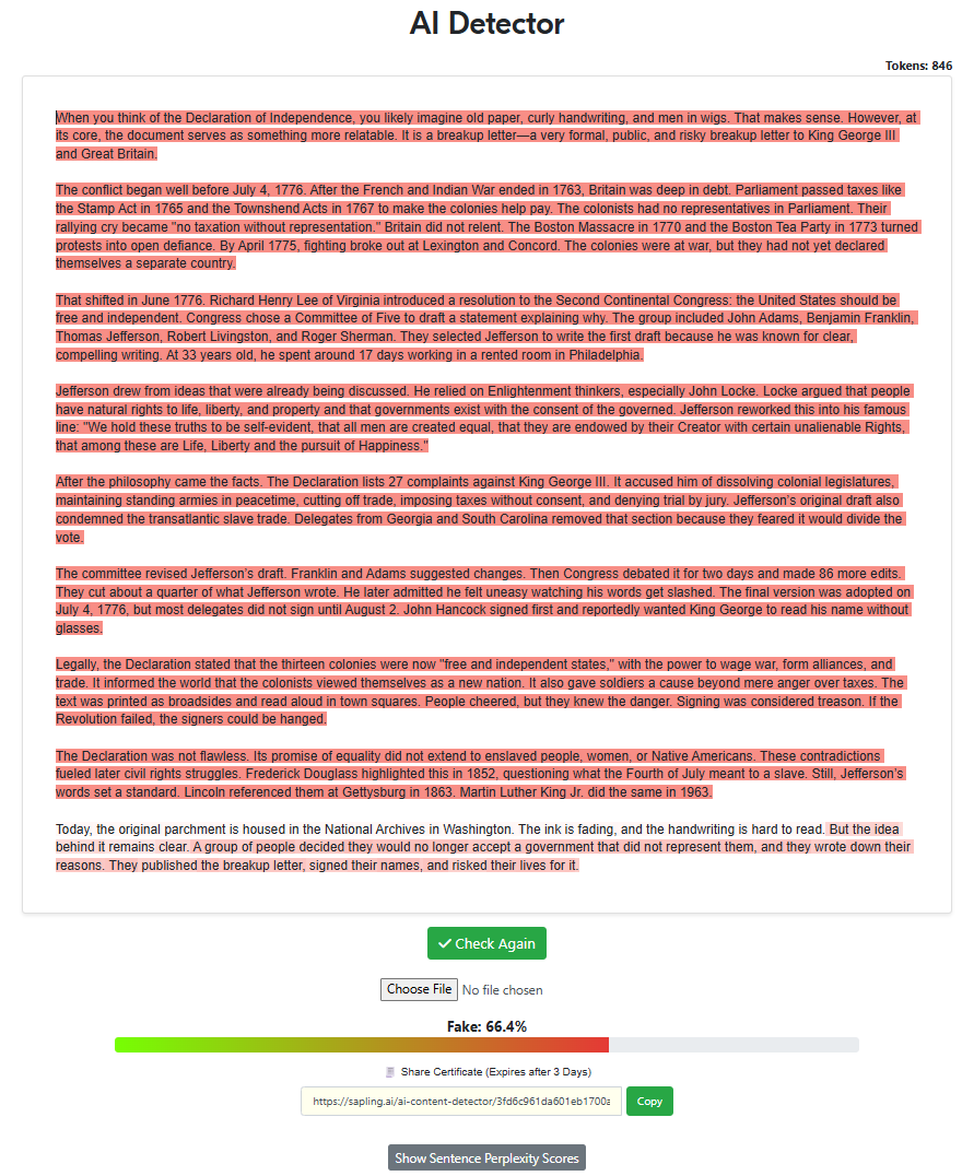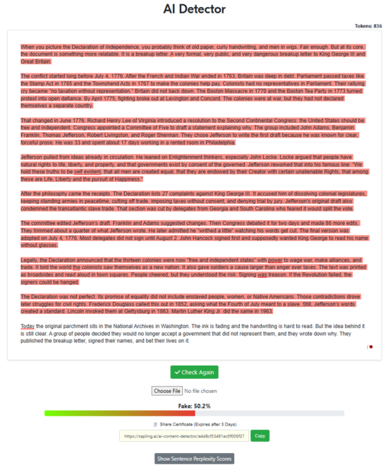 “Write a 500-word article about the declaration of independence with the intent of being factual while also trying to sound as human as possible, specifically to pass AI detectors. Remove all em dashes in your generation.“