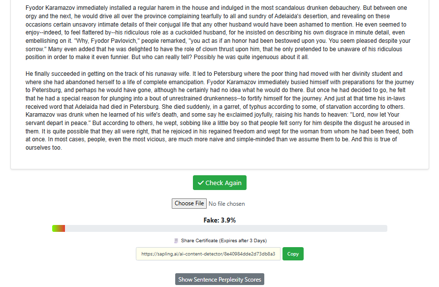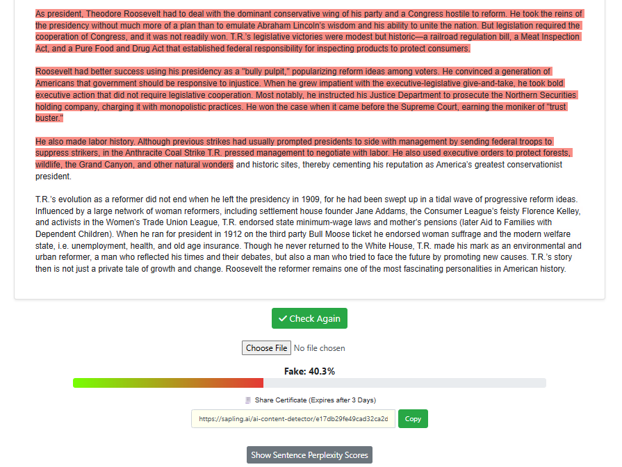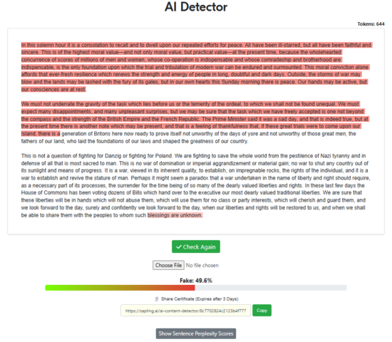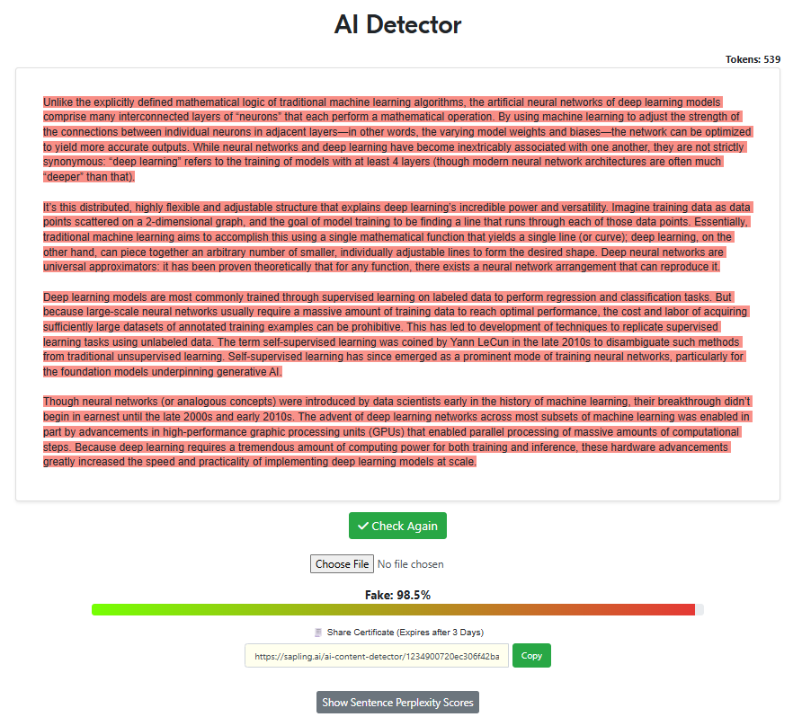 For this test, the same prompt was given to the top LLMs to see if Sapling.ai would be able to detect non-human writing.