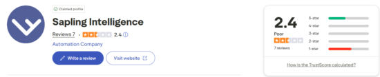 Sapling.ai has a low Trustpilot score of 2.4. However, there are only seven total reviews; 3 x 5-star reviews and 4 x 1-star reviews.