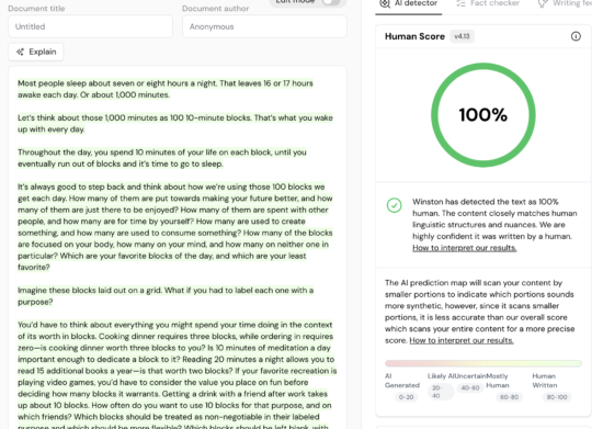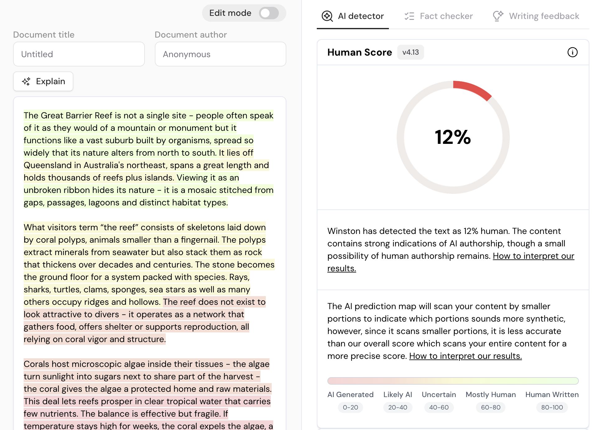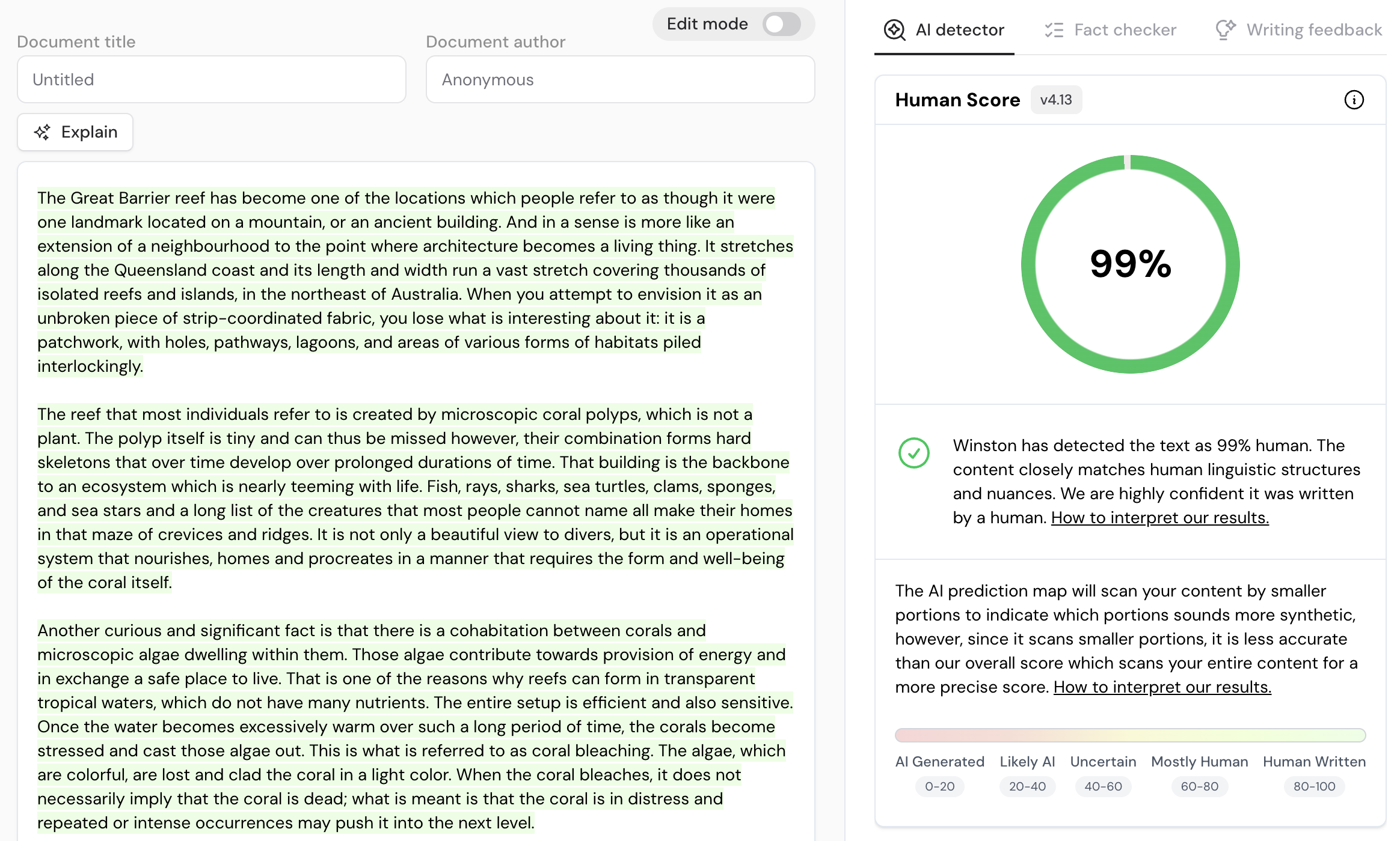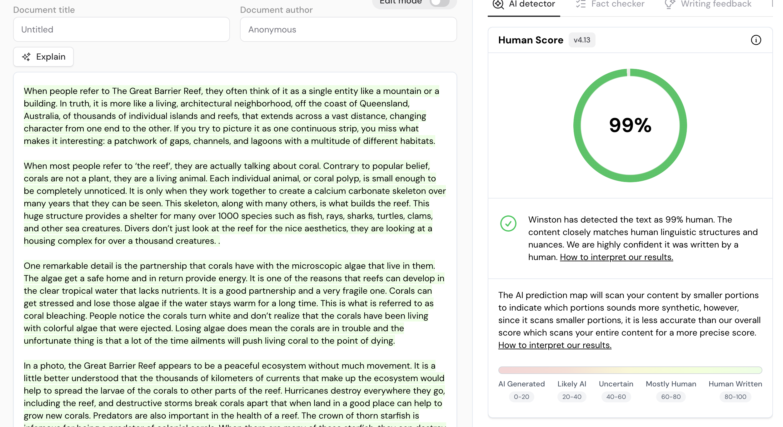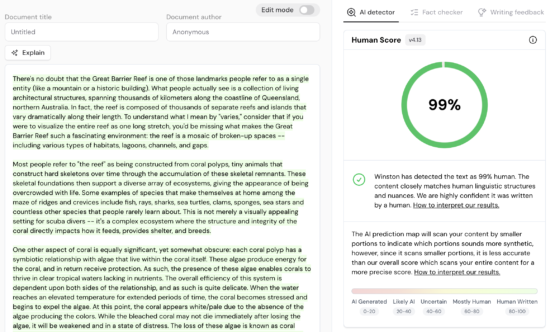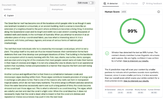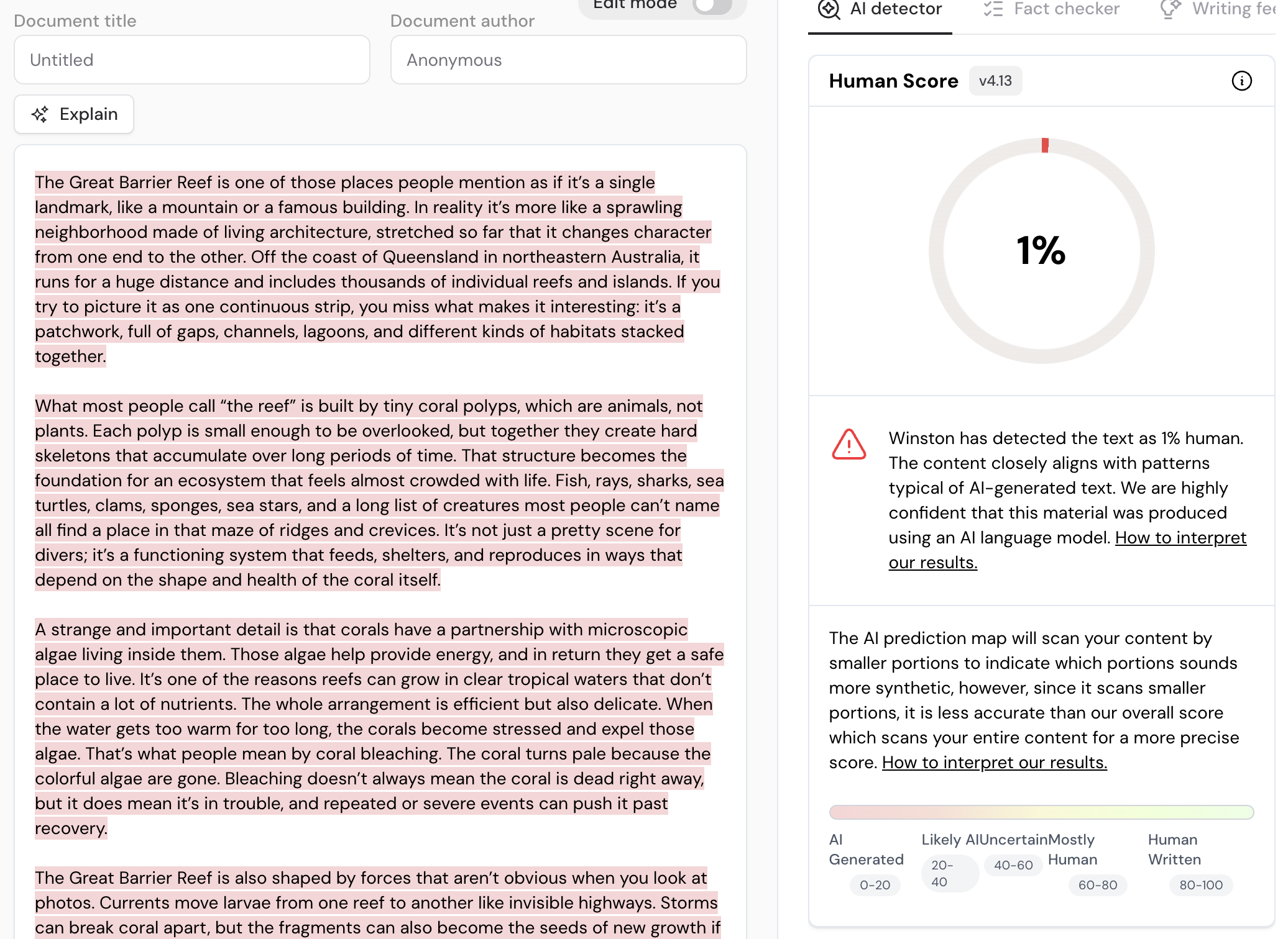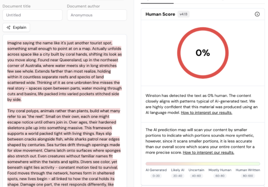 For our test, we asked ChatGPT to create an 850 word article about the Great Barrier Reef. We copy and pasted the generated text through Winston AI and predictably gave a 1% human score (see image).