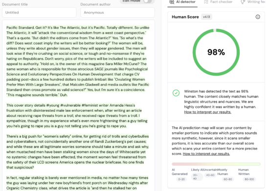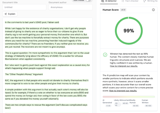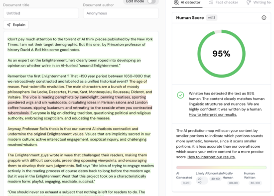 Winston AI (gowinston.ai) is an online AI detector that launched on January 28, 2023[1], and claims to have a 99.98% accuracy rate when checking AI content.[2] The website targets educators and companies seeking to verify that writing is human-generated.
